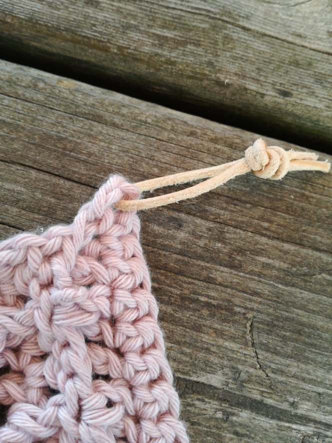 - Sista varvet görs en fm i varje m. Virka 4 lm och gör en sm i samma m som sista fm gjordes (det blir en ögla som upphängningen ska knytas i).