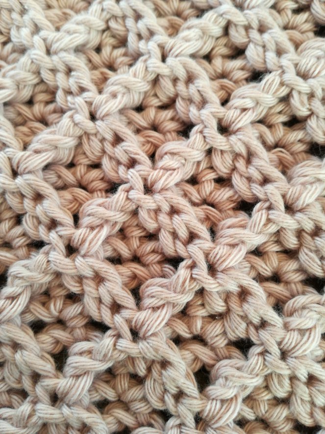 - Gör en vanlig stolpe, i nästa görs en st om förra varvets st bakifrån – alltså en reliefst bakom! Gör 2 vanliga st ,1 reliefst bakom osv hela v ut. Varvet avslutas med två vanliga st och 2 lm.(= nästa varvs första st)