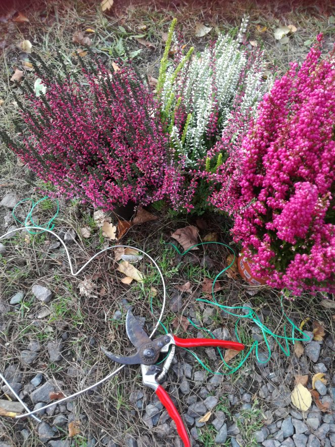 Det här använde jag : en hjärtformad ståltråd (jag knipsade av ”fötterna ”på en så’n man sätter som klätterstöd i blomkruka) , 3 krukor ljung, najtråd att vira fast de små buketterna med och en sekatör.
