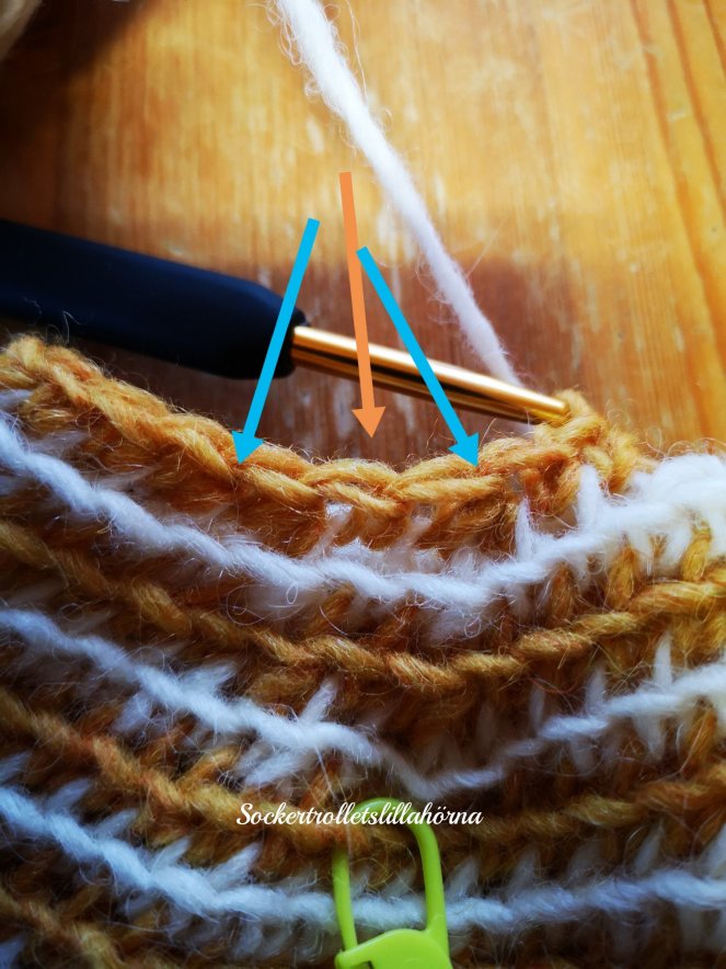De blå pilarna visar de maskorna som ska virkas tillsammans. Orange pil är mittenmaskan.