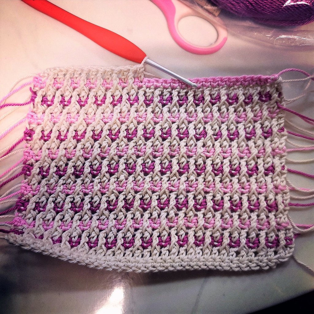 Ja, just så heter den, min nyvirkade löpare : ”Äppelblom”! Passande namn med underbara rosa nyanser och mjukt linnebeige!
