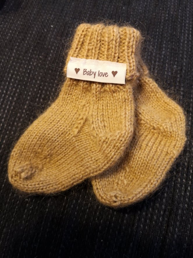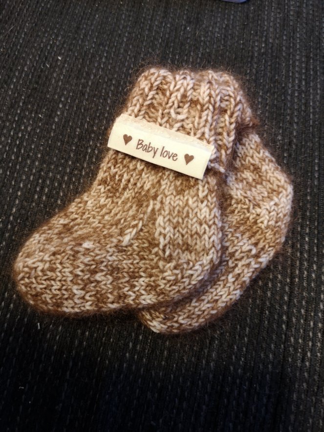 Ibland återupptäcker man att saker man inte gjort på väldigt länge kan vara väldigt roligt! Stickning lärde jag mig tidigt,redan innan jag började skolan kunde jag sticka. Kanske inte så avancerade saker då, men i alla fall. Det var min mormor som ofta satt och stickade sockor eller grytlappar, för att inte tala om virkade längder till överkast. Jag tyckte det såg så roligt ut att sticka och propsade på att få lära mig, något som jag haft stor glädje av hittills i livet. Fast just sticka strumpor har det inte blivit särskilt mycket av direkt, förrän en kusin till mig frågade en tid före jul om jag hade lust att sticka till deras lille pöjk. Så himla glad jag blev! Letade upp ett basmönster på Järbos hemsida som passade garnet jag skulle göra av, ett baby merino-garn som utlovas vara stick-fritt! Första paret följde jag mönstret till punkt och pricka, men se’n var jag fast och helt enkelt tvungen att testa andra varianter( dock av samma basmönster). Ett tips jag läst någonstans var att lägga till en tunn mohairtråd till den ordinarie garntråden, vips så blir sockan ännu mjukare. En tyglabel syddes på och sockan blev ännu gulligare… Tror det till slut blev 7 eller 8 par i olika varianter innan jag skickade iväg dom, fantastiskt roligt!!!