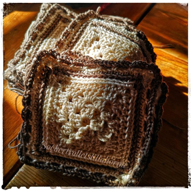 Våren är här på riktigt, eller snart kan man kanske kalla det försommar? Hursomhelst så tycker jag det är ljuvligt vackert den här tiden, alla gröna nyanser som skimrar i solens sken. Skulle vilja stanna klockan en tid just nu, få allt att gå i slowmotion, pollentider till trots. Just idag har jag tagit ”pluggledigt”, tillåter mig själv lite återhämtning dagen efter prov plus inlämningsdag. Har hållit på med en egen mormorsruta, det är ju ingen ny uppfinning precis, men jag har lagt till varv lite som jag vill. Tanken är att det ska bli en mini-pläd eller vad man kan kalla det, den ska ligga som huvudskydd i en finfåtölj. Som regel har man hårprodukter som ibland har en tendens att ge spår. Det är ju lättare att tvätta ett sådant skydd än en fåtölj liksom.